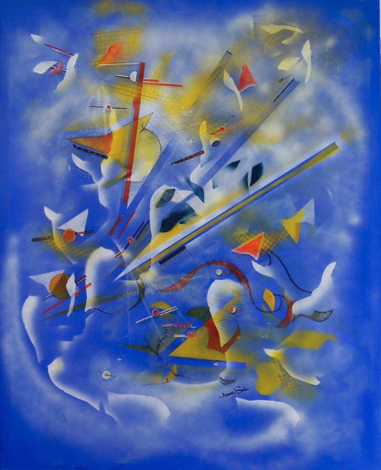 In questo spazio blu che avvolge e sospende, ogni forma sembra nascere da un pensiero che affiora lentamente, come se l’universo stesso stesse ricordando qualcosa di intimo. Le traiettorie luminose, i rossi improvvisi e i gialli vibranti non gridano: pulsano, si espandono come emozioni che cercano di superare il silenzio interiore.