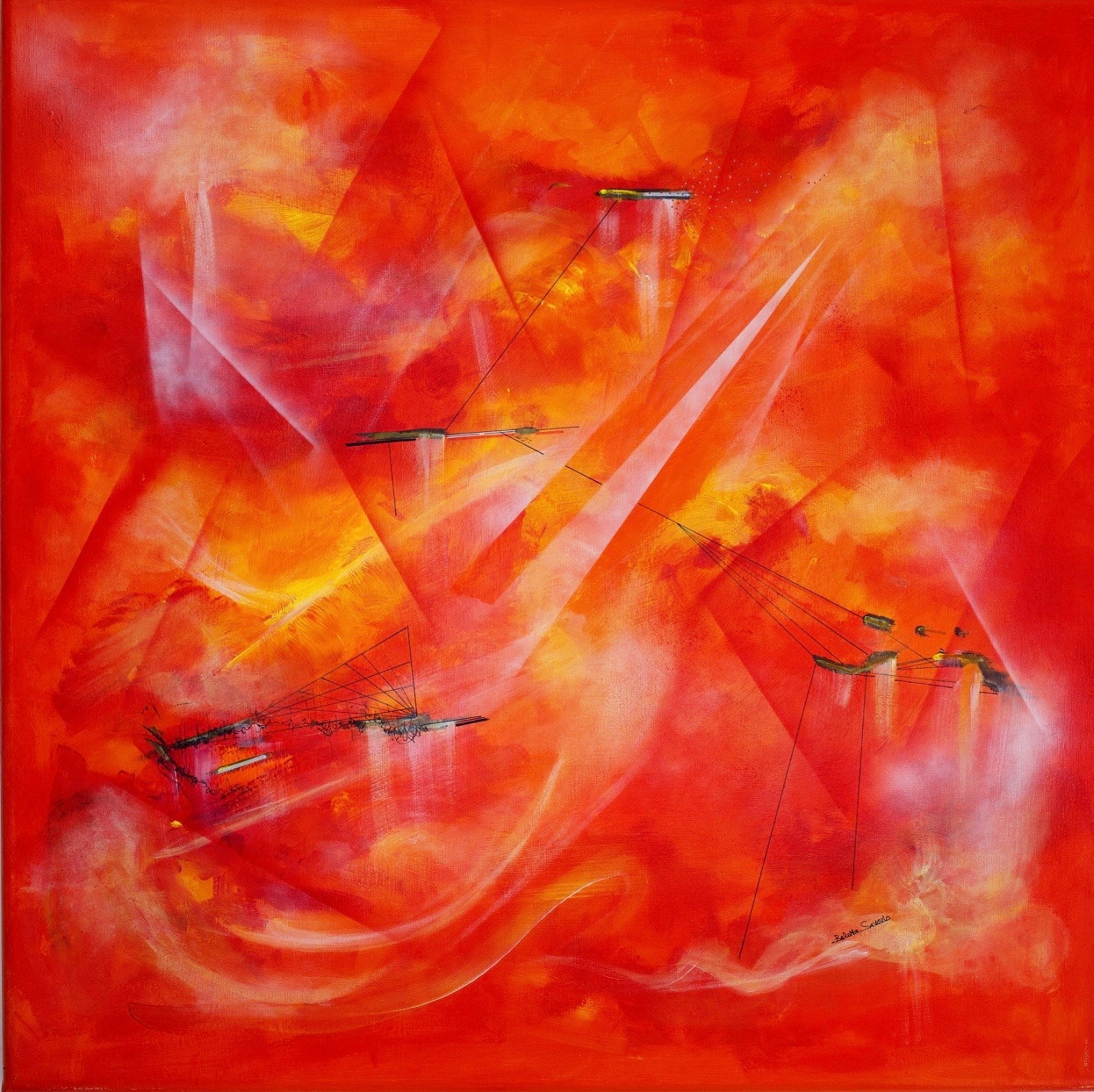 L'opera vibra come un’energia che non si vede ma si percepisce, un movimento interiore che attraversa il rosso ardente e lo trasforma in spazio emotivo. Linee sottili, punti, traiettorie e geometrie fluttuanti diventano onde, segnali, pulsazioni: frammenti di un linguaggio nascosto che si rivela solo nell’istante in cui viene osservato.La luce irrompe e si spezza, creando campi di intensità che cambiano direzione come pensieri in transito. Ogni forma è una frequenza, ogni intersezione un battito. L’invisibile prende corpo, diventa ritmo, diventa presenza. Un’emozione che si propaga oltre la tela, come un’eco che continua a muoversi anche quando tutto sembra immobile.