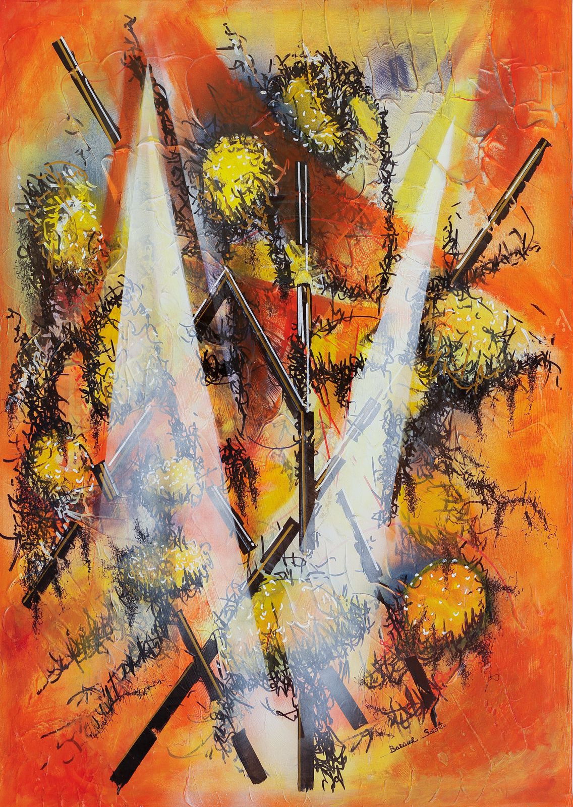 Un'esplosione di luce materica che rompe ogni confine.Quest'opera incarna l'energia pura, la vitalita che scorre incontrollabile e liberatrice. Non è semplice luminosità, ma una forza tangibile che danza, si contorce e si espande in ogni direzione. La materia diventa luce, la luce diventa movimento, e il movimento diventa esistenza. C'è una gioia primordiale qui, una celebrazione della vita che esplode senza paura, senza limiti. Ogni pennellata é un grido di esistenza, una protesta di bellezza contro l'indifferenza. Quest'opera parla di potenza creativa, di quel fuoco interiore che non può essere spento.Non è aggressiva, ma espansiva - come un cuore che batte a un ritmo diverso, più veloce, più intenso. L'esplosione non distrugge, rigenera. E la manifestazione dell'istinto più antico:vivere, brillare, essere visibili.