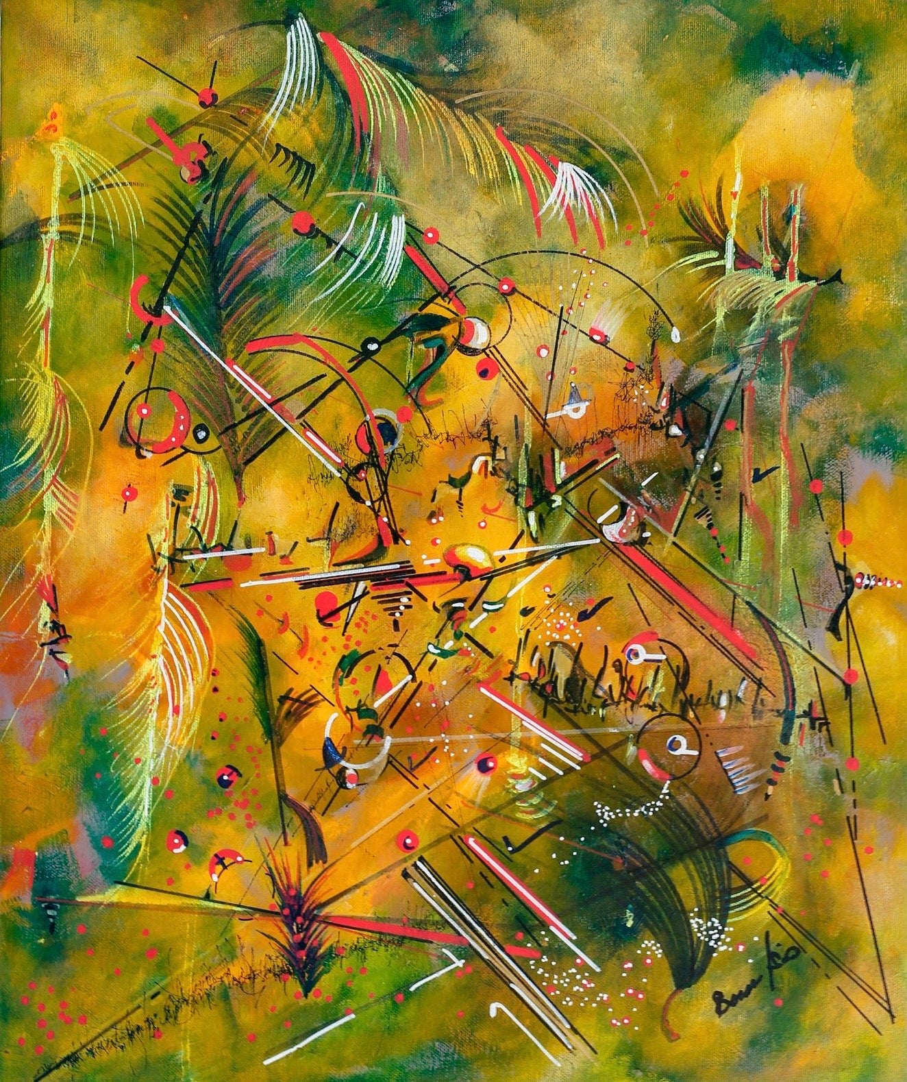 In questa trama vibrante di gialli, verdi e aranci dorati, il caos non esplode: respira. Ogni linea, ogni puntino rosso, ogni arco luminoso sembra nascere da un impulso profondo, come se l’interiorità stessa stesse componendo la propria musica segreta.