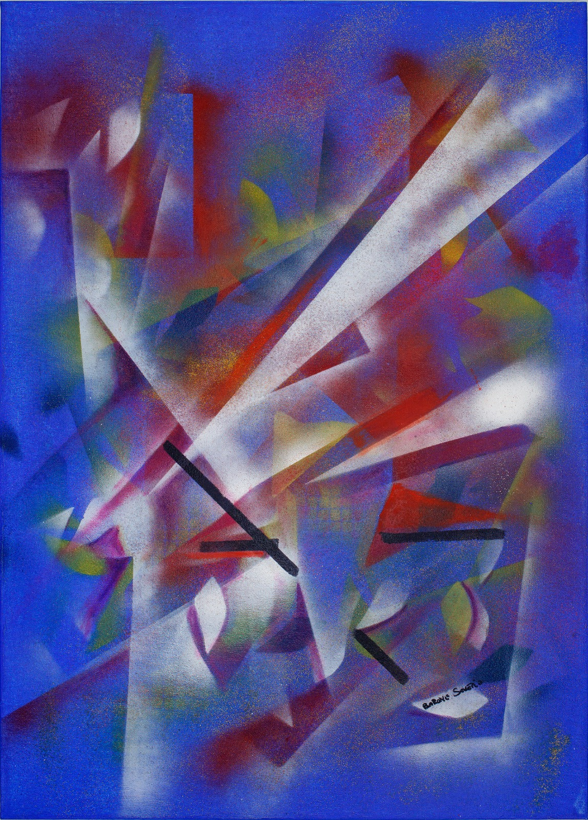 In questa opera il colore si muove come un’emozione che non trova mai un punto fermo: si frantuma, si espande, si ricompone. Le lame di luce attraversano il blu profondo e il rosso caldo creando un riflesso che vibra, si scompone e si trasforma, come un pensiero che cambia direzione nell’istante stesso in cui nasce. Le linee nere tentano di dare un ordine, ma l’emozione prevale, scivola oltre ogni limite e si riflette in una continua instabilità creativa. Un equilibrio che vive proprio nella sua impermanenza.